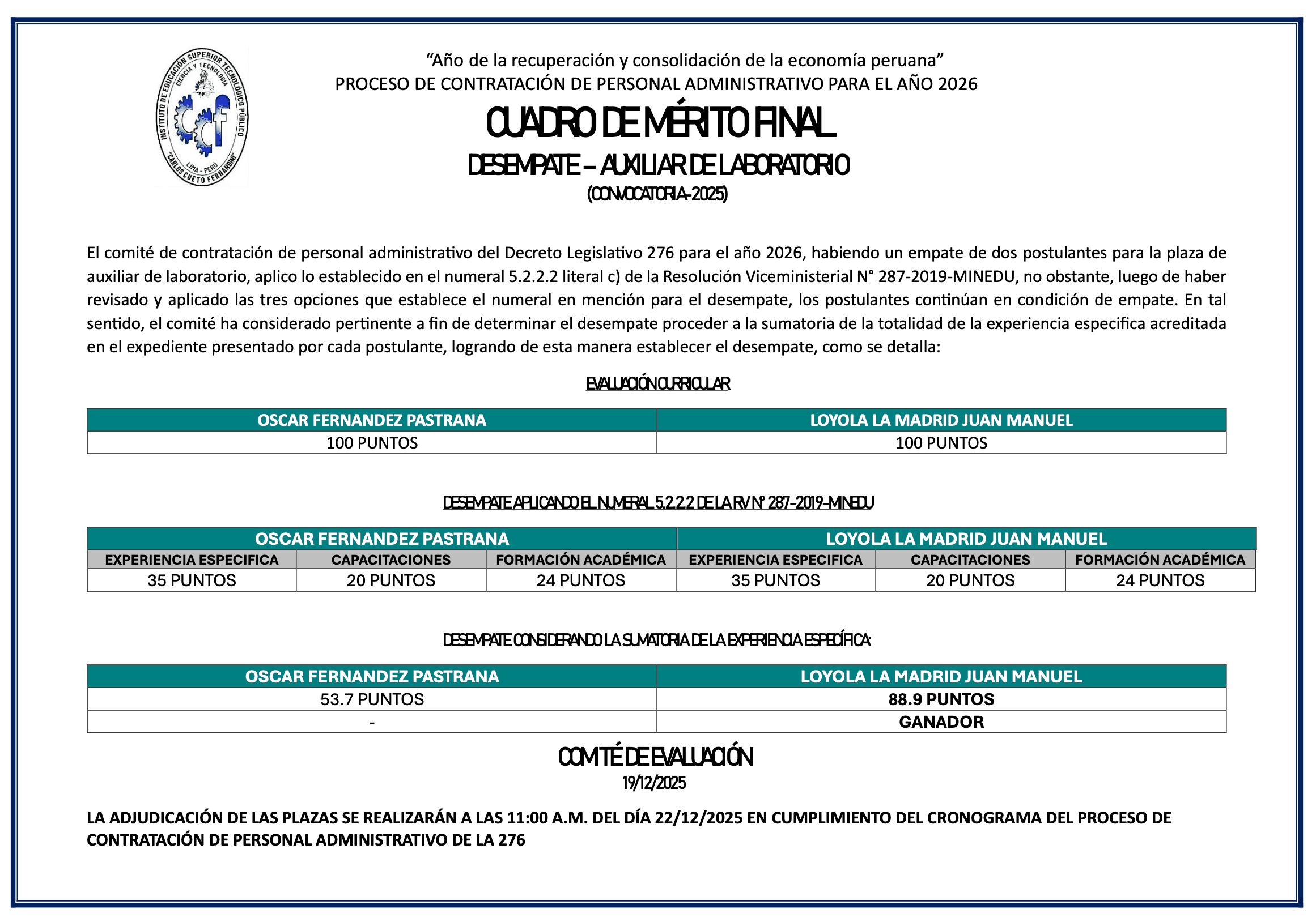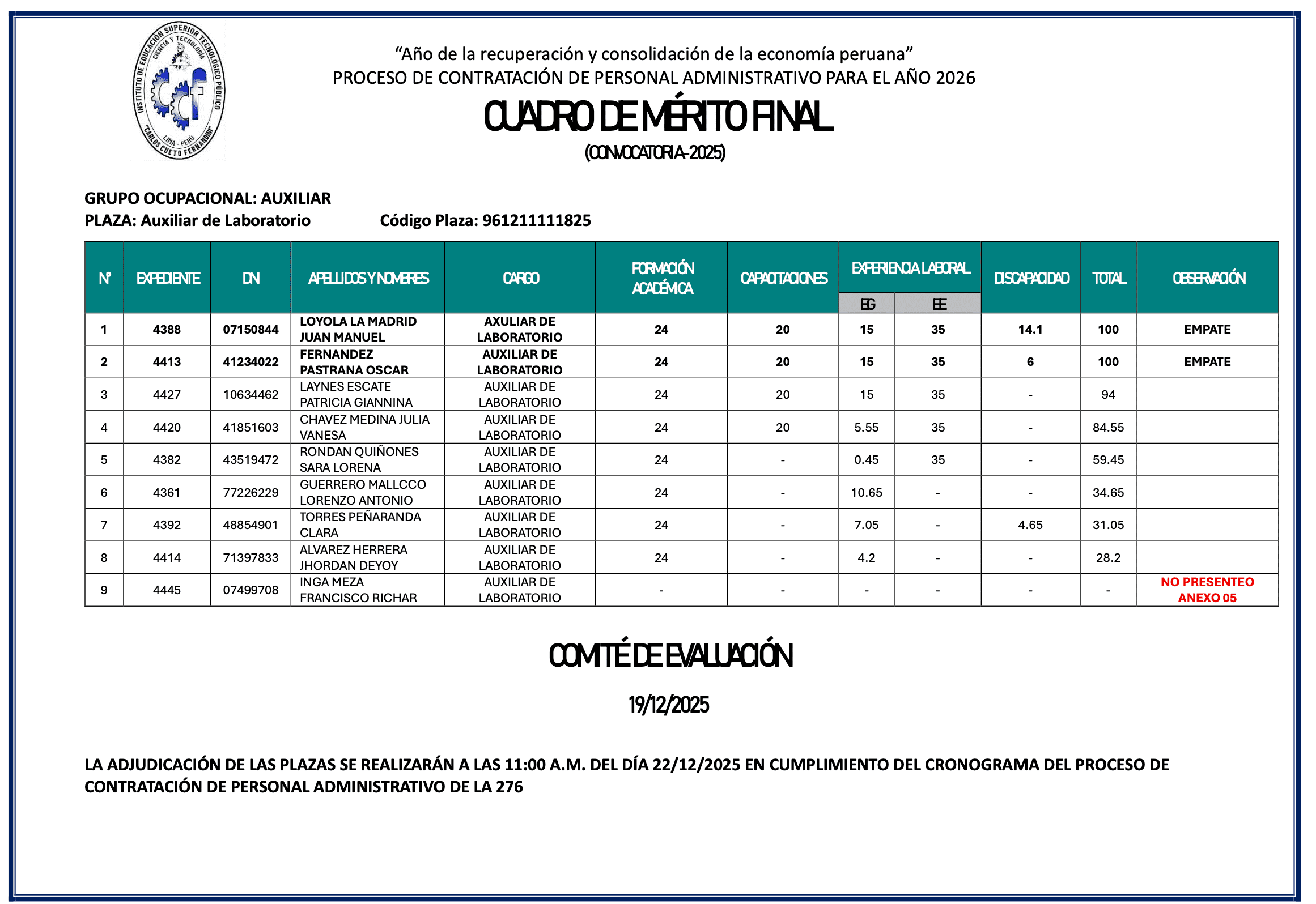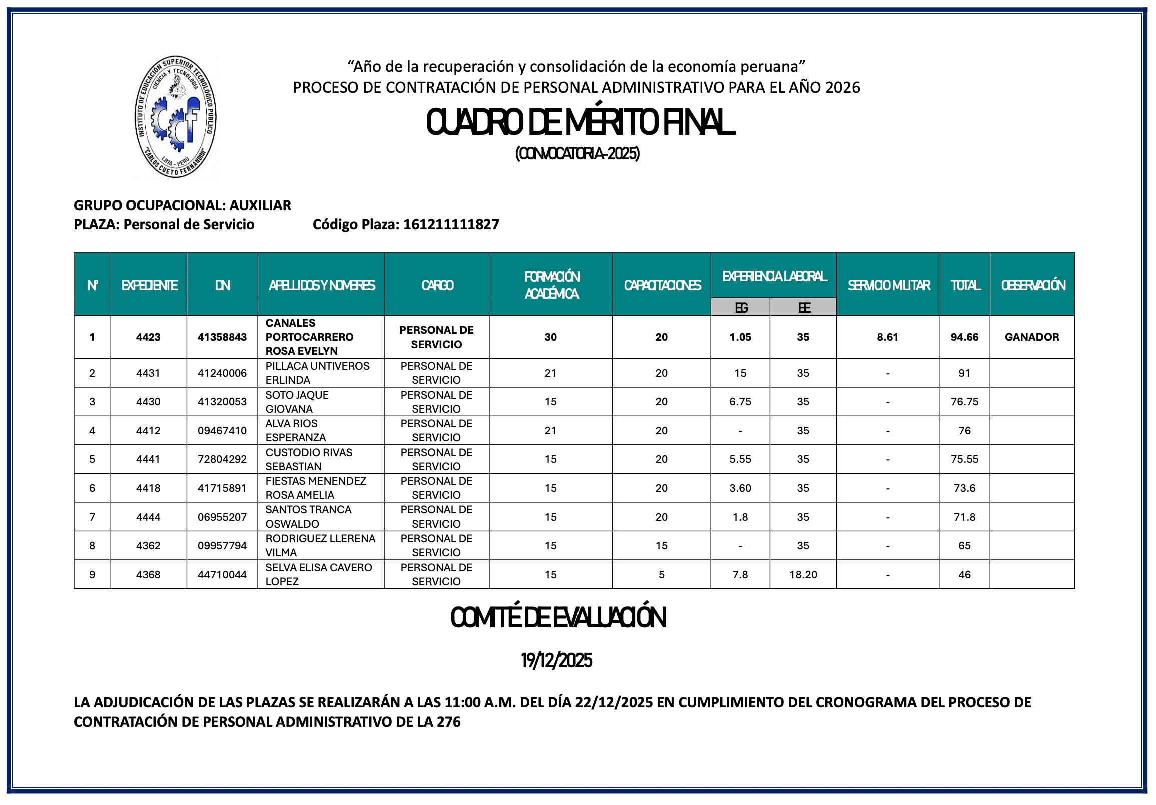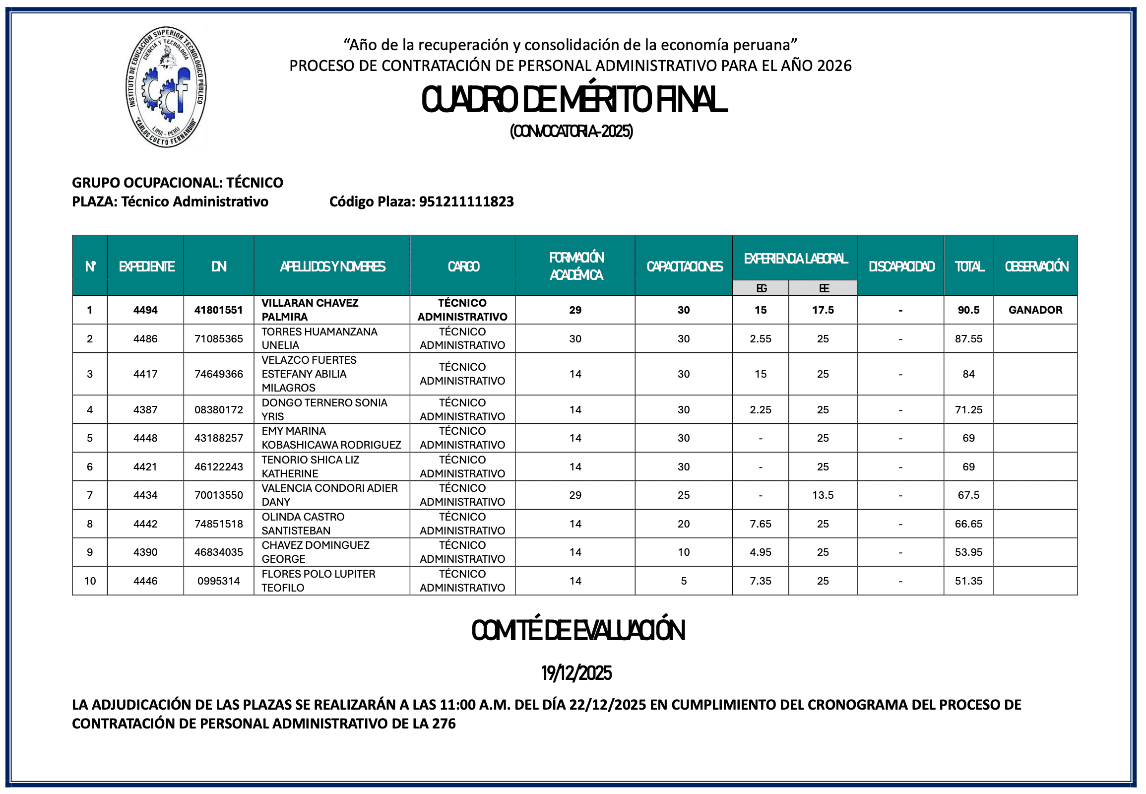 Para mayor información revisa el siguiente enlace: CUADRO DE MERITO FINAL ADM dic 2025